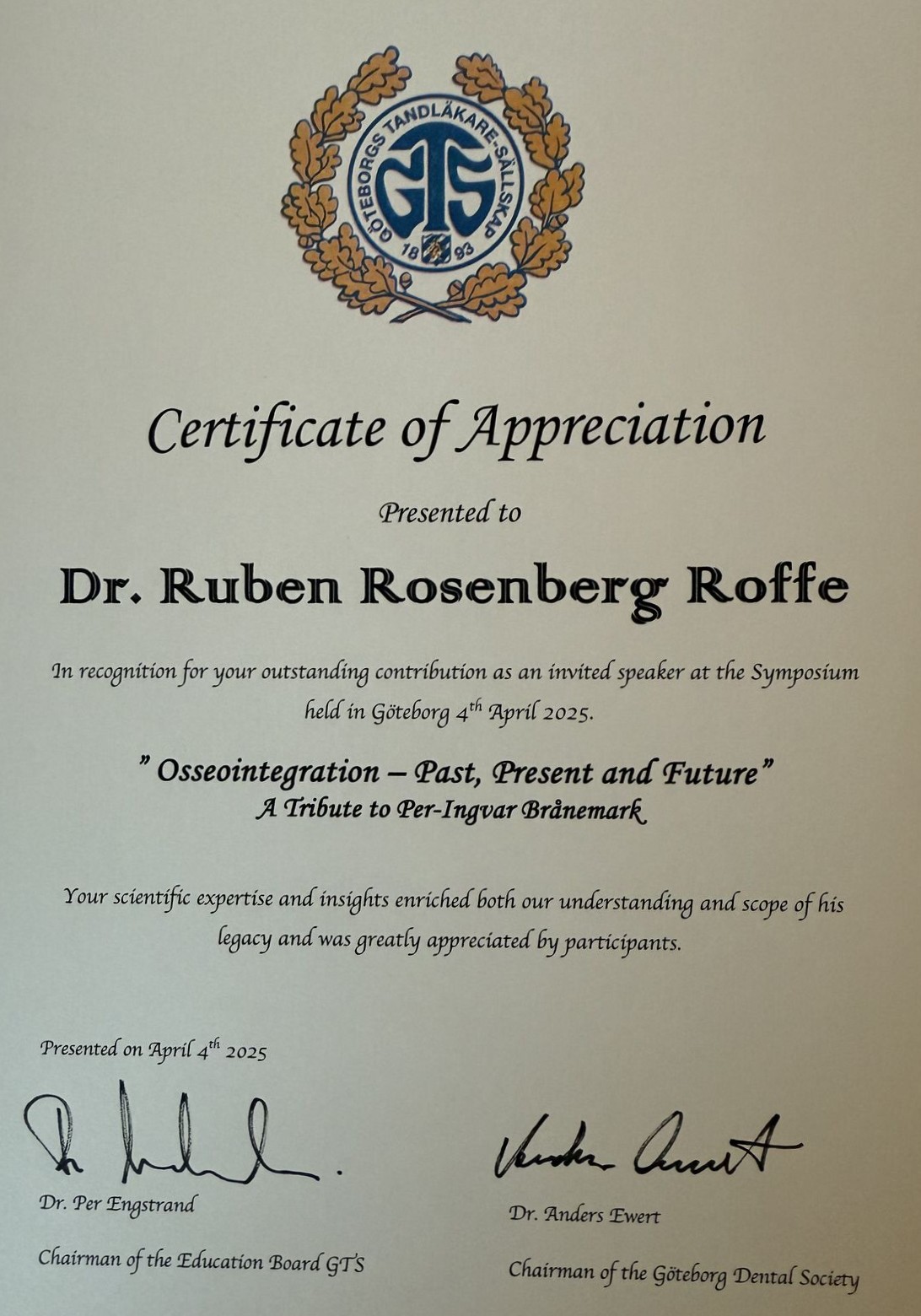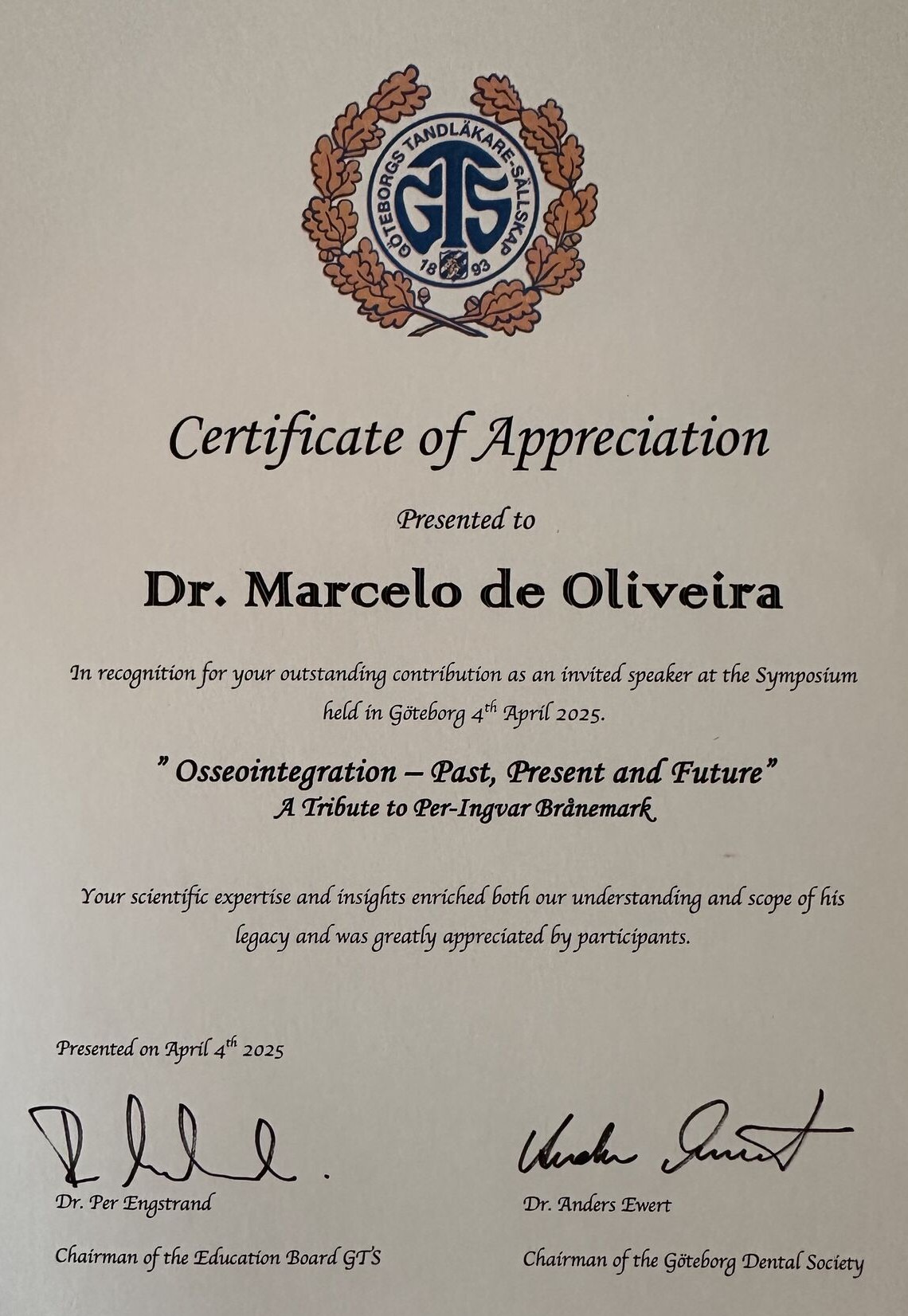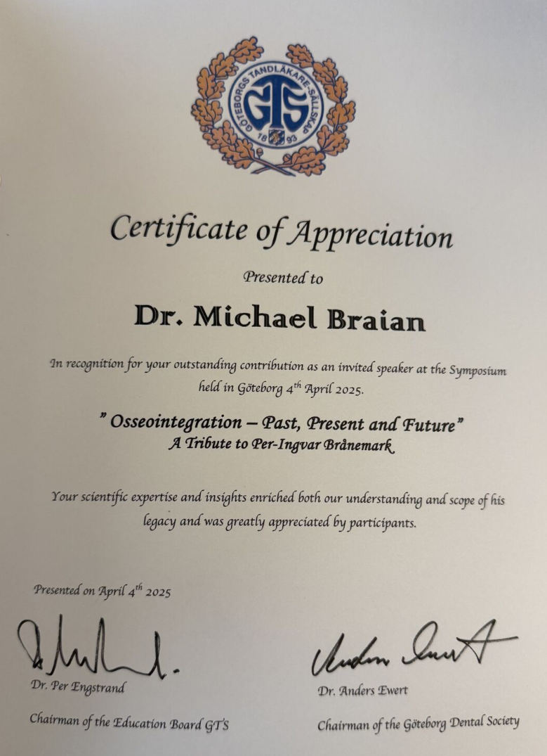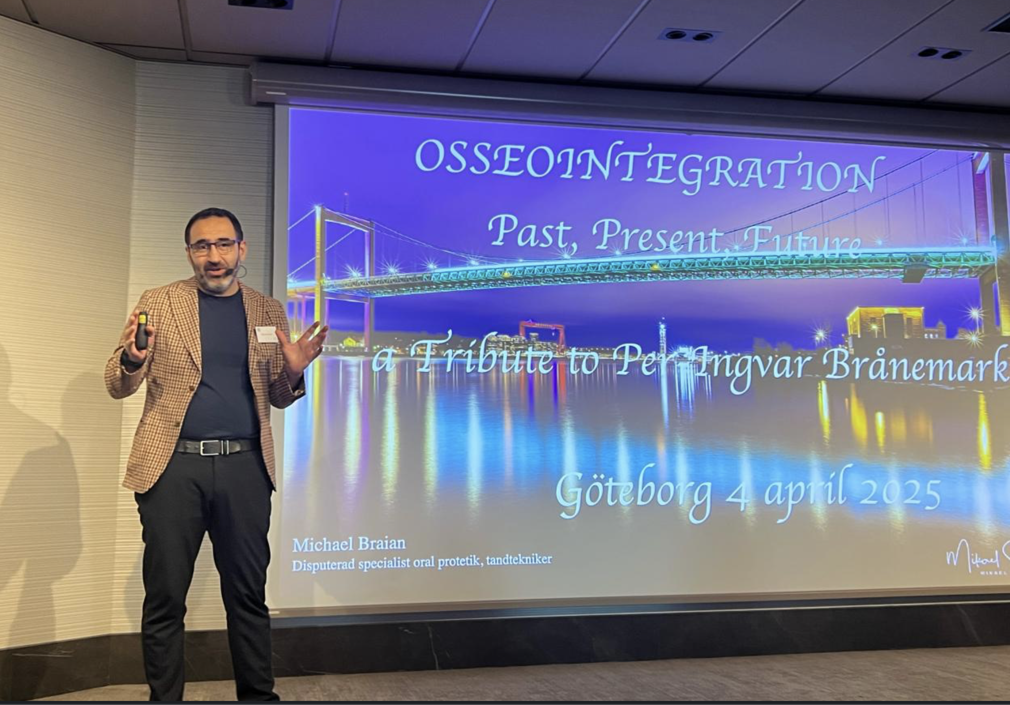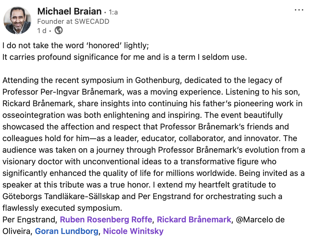 Professor Brånemarks vänner och kollegor Ruben Rosenberg (Chile), Marcelo Oliveira, (Brasilien/Kanada) och Göran Lundborg (Malmö/Lund) talade om hans storhet som ledare, utbildare, samarbetspartner och innovatör. De visade exempel på patienter som inte bara behandlats med implantat för att fästa tänder utan även näsor, ögon, kinder, ben, armar och fingrar. Hans innovationer har också gett döva människor sin hörsel tillbaka. Professor Brånemarks visioner och innovationer har verkligen höjt livskvaliteten för miljontals människor världen över.