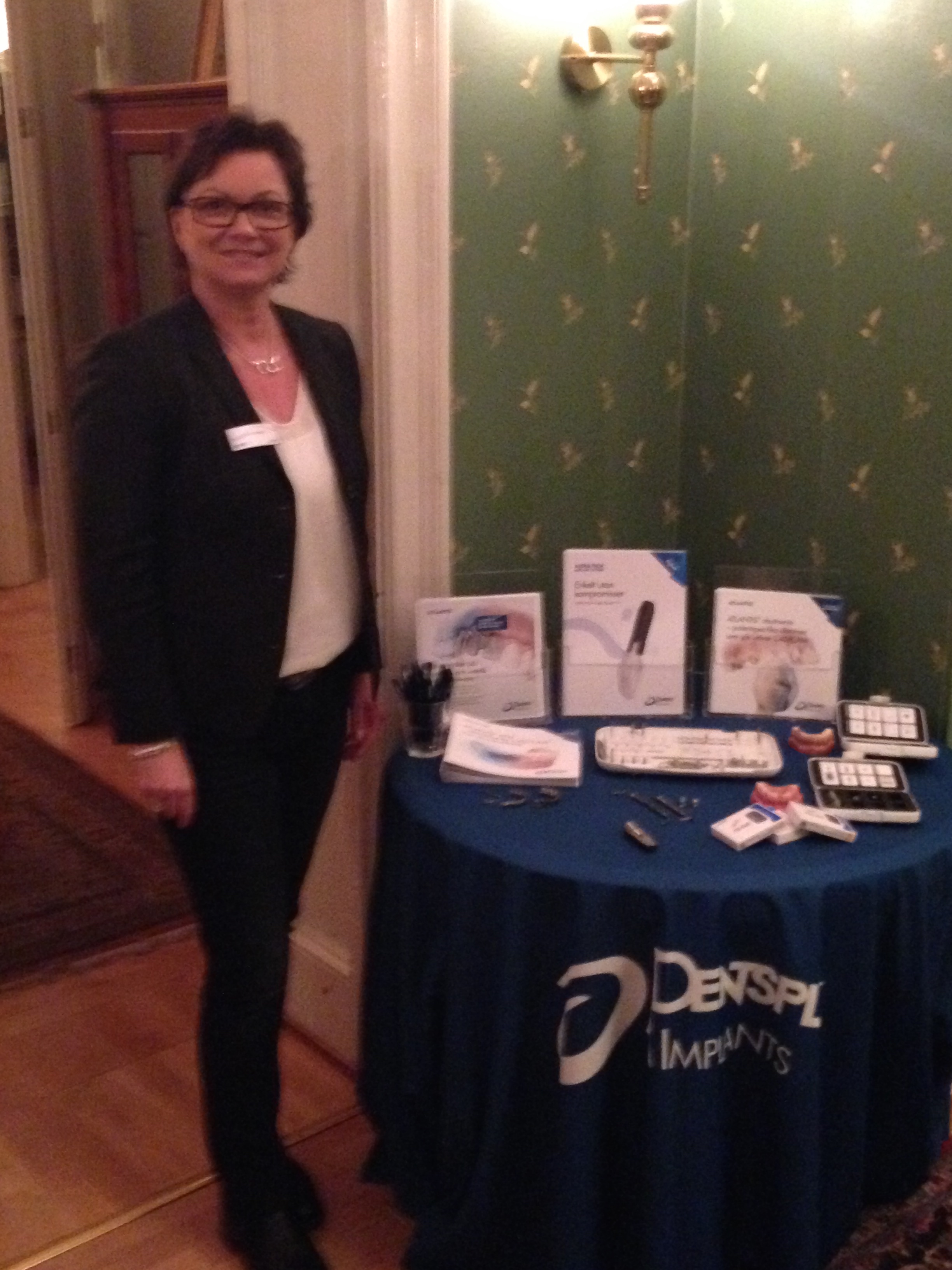 Mötet var denna dag sponsrat av Dentsply Implants. Lena Sandberg bjöd på en presentation av deras implantatsystem. De har gjort om sitt system med nya färgkodningar och hon berättade att ”ALLT är förändrat, men INGET är nytt!” Det nya systemet är väldigt enkelt att överskåda med samma färgkodningar genom hela kedjan med tandläkare och tandtekniker.