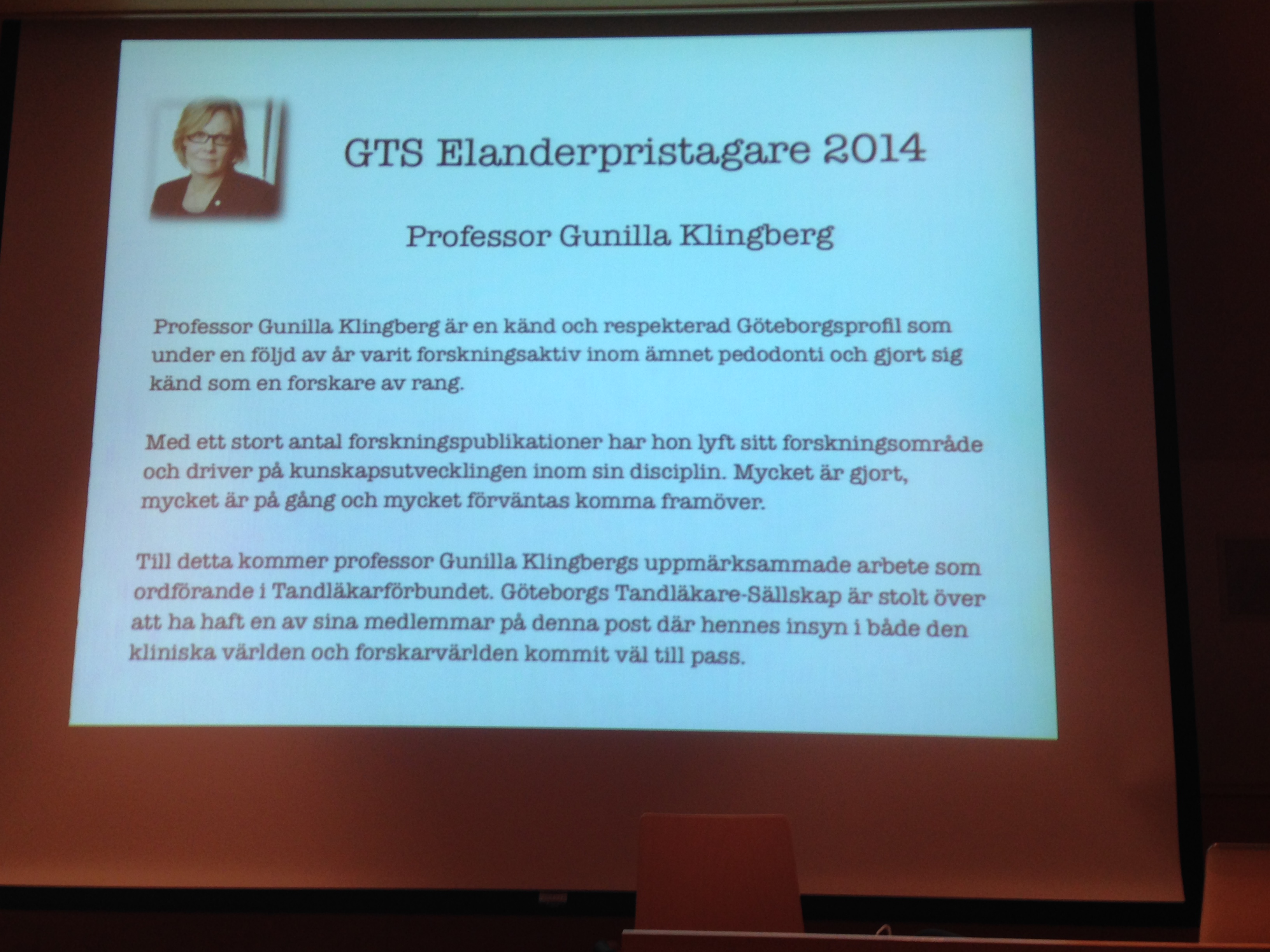 Nästa punkt på dagordningen var årets Elanderpristagare. Stipendienämnden kommer med förslag till styrelsen som i år beslutade att Elanderpriset ska gå till professor Gunilla Klingberg. Hon kommer vid högtidssammanträdet den 17 januari att bjuda på en föreläsning och ta emot priset. Motiveringen löd: ”Professor Gunilla Klingberg är en känd och respekterad Göteborgsprofil som under en följd av år varit forskningsaktiv inom ämnet pedodonti och gjort sig känd som en forskare av rang. Med ett stort antal forskningspublikationer har hon lyft sitt forskningsområde och driver på kunskapsutvecklingen inom sin disciplin. Mycket är gjort, mycket är på gång och mycket förväntas komma framöver. Till detta kommer professor Gunilla Klingbergs uppmärksammade arbete som ordförande i Tandläkarförbundet. Göteborgs Tandläkare-Sällskap är stolt över att ha haft en av sina medlemmar på denna post där hennes insyn i både den kliniska världen och forskarvärlden kommit väl till pass.”