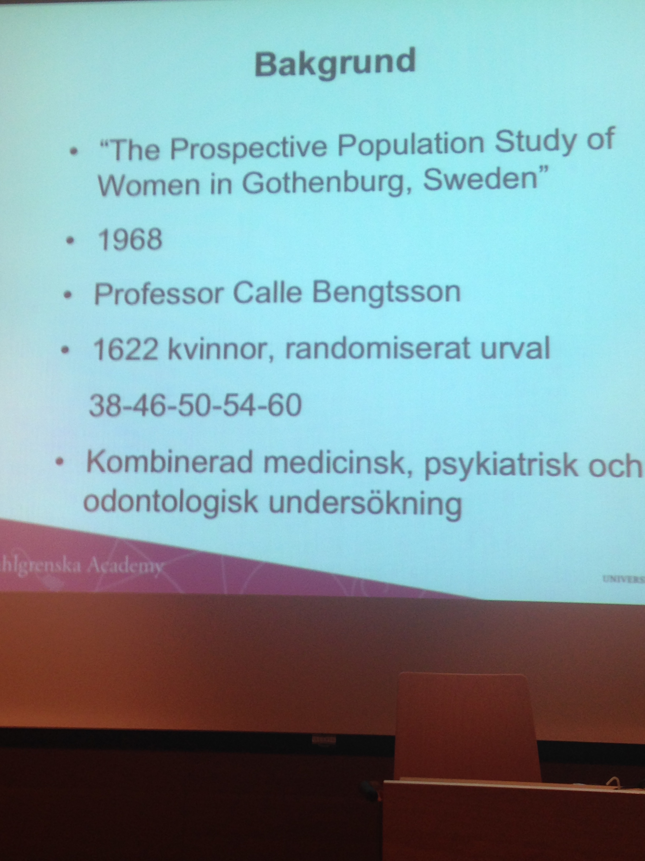 Efter mötesförhandlingarna fick vi höra på två intressanta föreläsningar. Först ut var GTS stipendiat tandläkare Anette Wennström, som forskar på deltid och övriga tiden arbetar som tandläkare i Folktandvården Kortedala. Hon är involverad i ”The Prospective Population Study of Women in Gothenburg, Sweden”, även kallad ”kvinnostudien”. Det är en kombinerad medicinsk, psykiatrisk och odontologisk undersökning där man följt kvinnor sedan 1968 och vid vissa intervall går in och extraherar data. Anette har hand om den odontologiska delen nu.