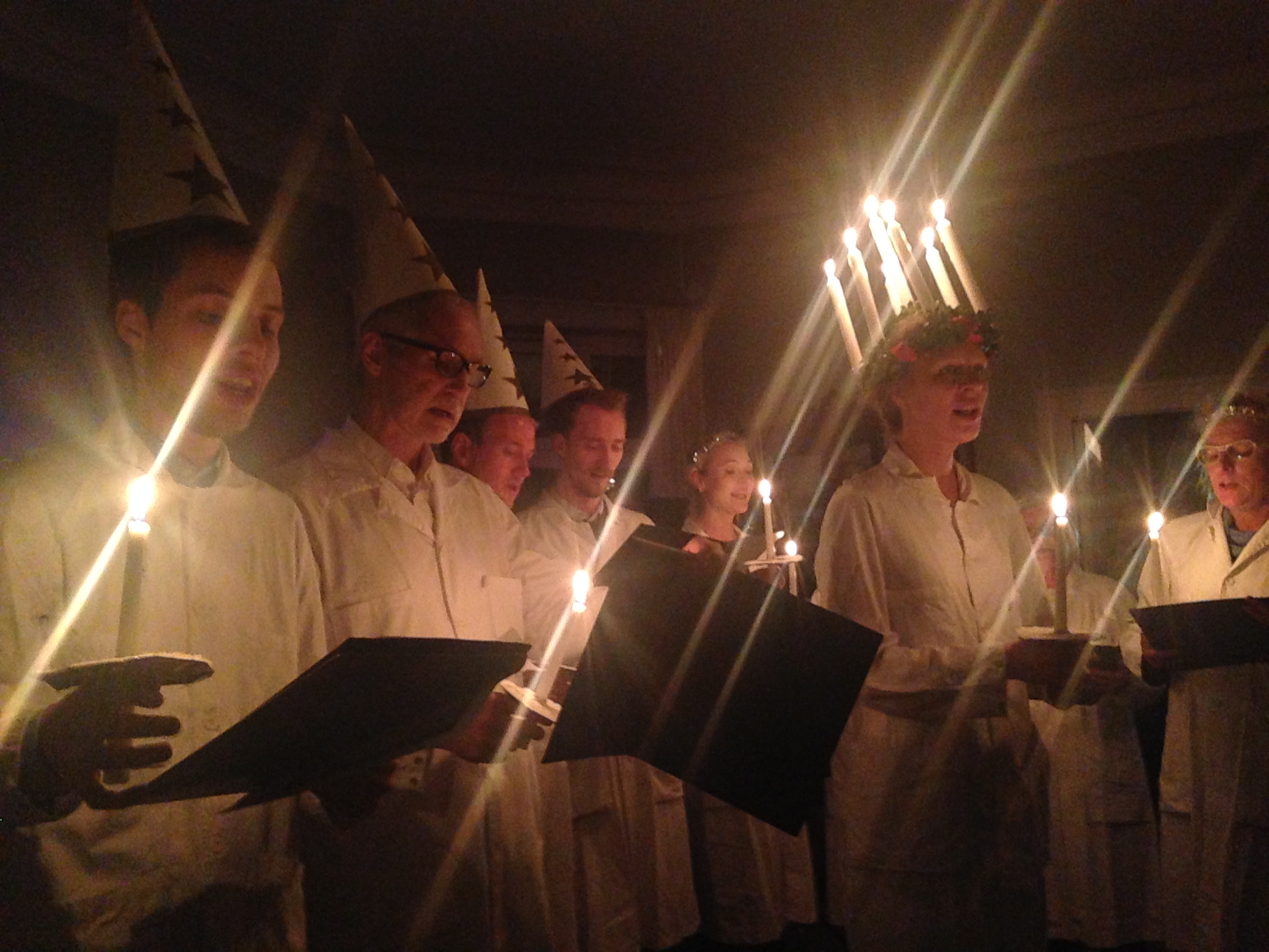 Efter det fullspäckade mötet gick vi ner till restaurangen där det bjöds på julbord med dryck. Innan vi fick maten bjöds det på en överraskning i form av ett luciatåg bestående av bl.a. ordförande Anna Bogren, den odontologiska studentkören ”Tandhalsarna” och Peter i köket. Det bjöds på fin stämsång och en omskriven Staffansång med odontologiskt tema. Under julbordet underhöll sedan ”the Tänder-men” som består av tre kollegor. De bjöd på härliga låtar och ett glatt humör.