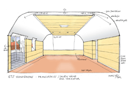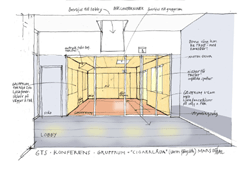blir förråd för stolar, bord mm. Kapphyllor görs vid nuvarande ”samlingsskåp”. Toaletter restaureras. Nytt trägolv i stora salen och grupprummet samt klinkergolv i lobbyn. Golvvärme. Väggar i stora salen och grupprummet i ljus träfanér. Anläggning för uppvärmning/kylning av luft samt friskluft. AV-utrustning.