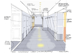 En öppen genomgående lobby löper hela vägen utanför salen och avgränsas mot grupprummet med en glasvägg. Tidigare garderob